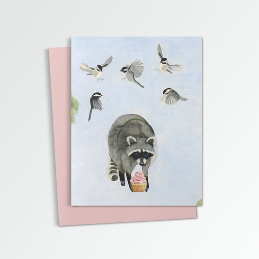 Chickadees and Raccoon w/ Cupcake Notecard (Blank Inside)
