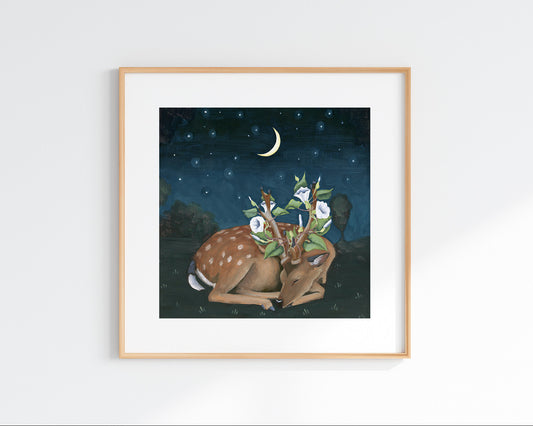 Deer w/ Moonflower and Crescent Moon Art Print (8x8)