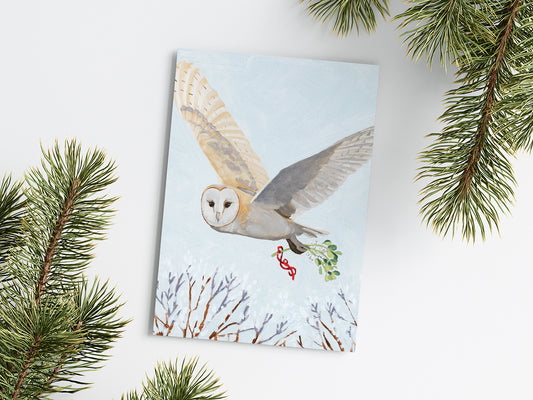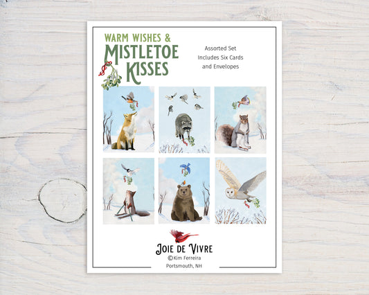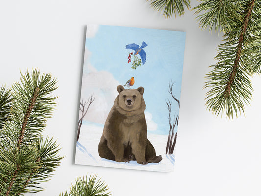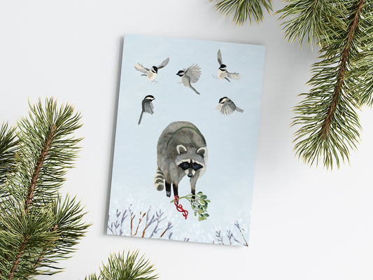 Raccoon, Chickadees & Mistletoe Notecard (Blank Inside)