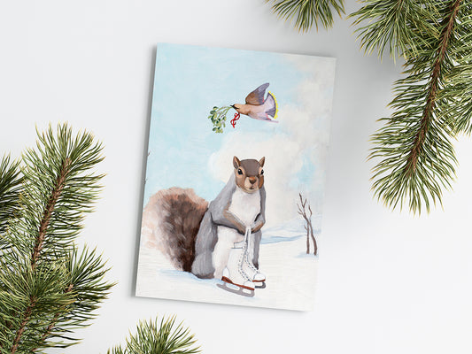Squirrel w/ Ice Skates & Mistletoe Notecard (Blank Inside)