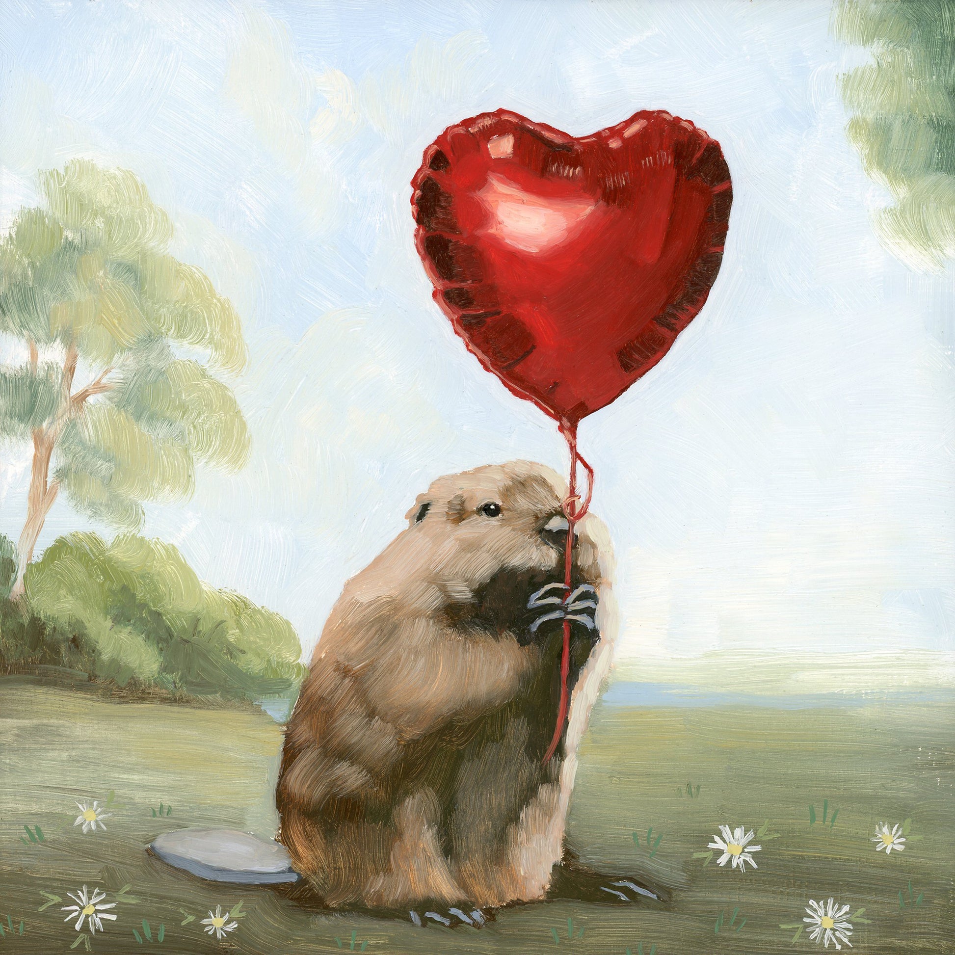 Beaver w/ Heart-shaped Balloon - 8x8 original oil painting