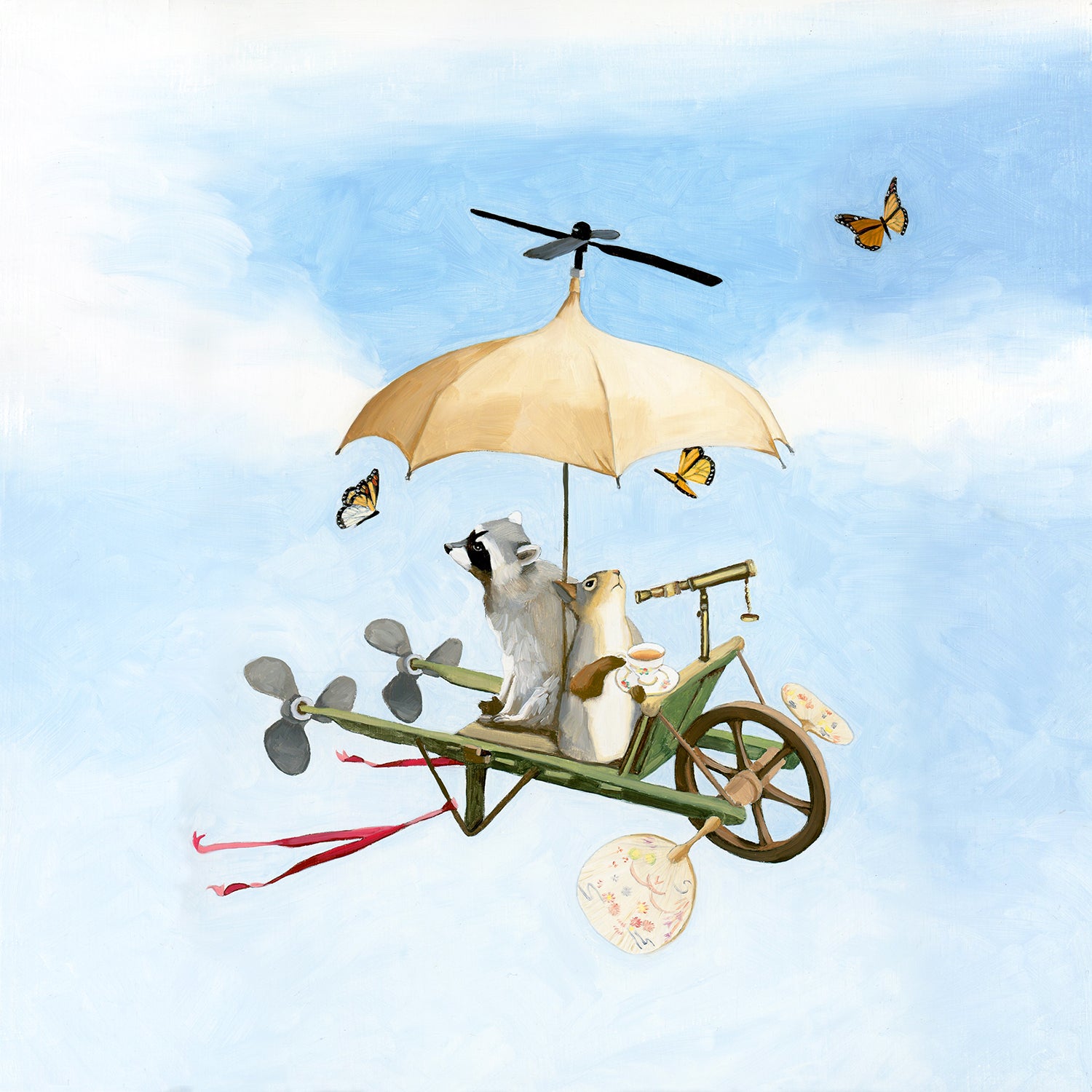 Inspired by Leonardo DaVinci, The Adventures of Goldie and Bear and childhood longings, I created a collection of flying machines celebrating ingenuity and all things with wings. This painting was the first in the series and features my grandfather’s wheelbarrow (from memory). It serves as the strong and sturdy base, as he was, and so much more, throughout my childhood.